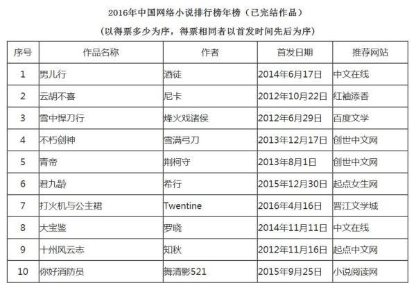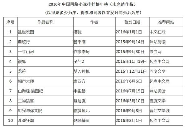 2016年中国网络小说排行榜年榜。 中国作家网图